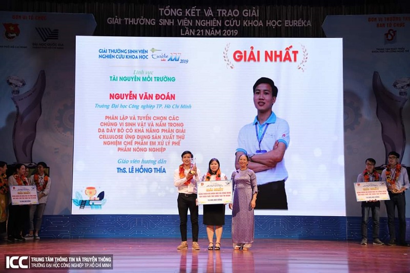 24-11-2019Với đề tài: "Phân lập và tuyển chọn các chủng vi sinh vật và nấm trong dạ dày bò có khả năng phân giải cellulose ứng dụng sản xuất thử nghiệm chế phẩm E.M xử lý phế phẩm nông nghiệp" của tác giả Nguyễn Văn Đoán dưới sự hướng dẫn của NCS.Lê Hồng Thía - thuộc Viện KHCN & QL Môi trường tham gia Eureka 2019 với các thành tích sau: