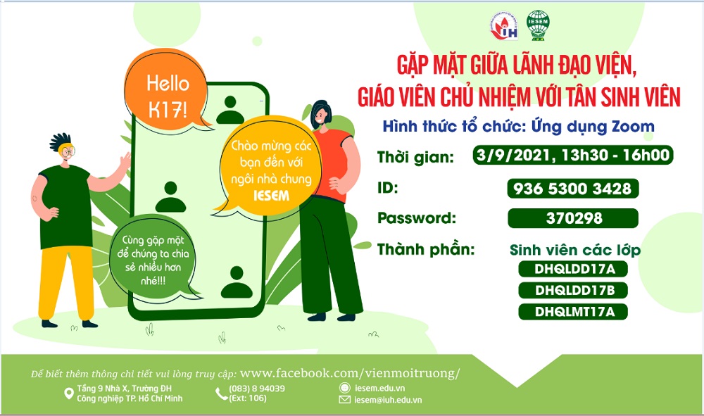 02-09-2021Thông báo: Viện KHCN & QLMT tổ chức buổi gặp mặt giữa Ban lãnh đạo Viện, Giáo viên chủ nhiệm với TÂN SINH VIÊN nhằm gặp gỡ, trao đổi, chia sẻ định hướng chuyên ngành cho các em. Đề nghị các em tham gia đầy đủ và đúng giờ.